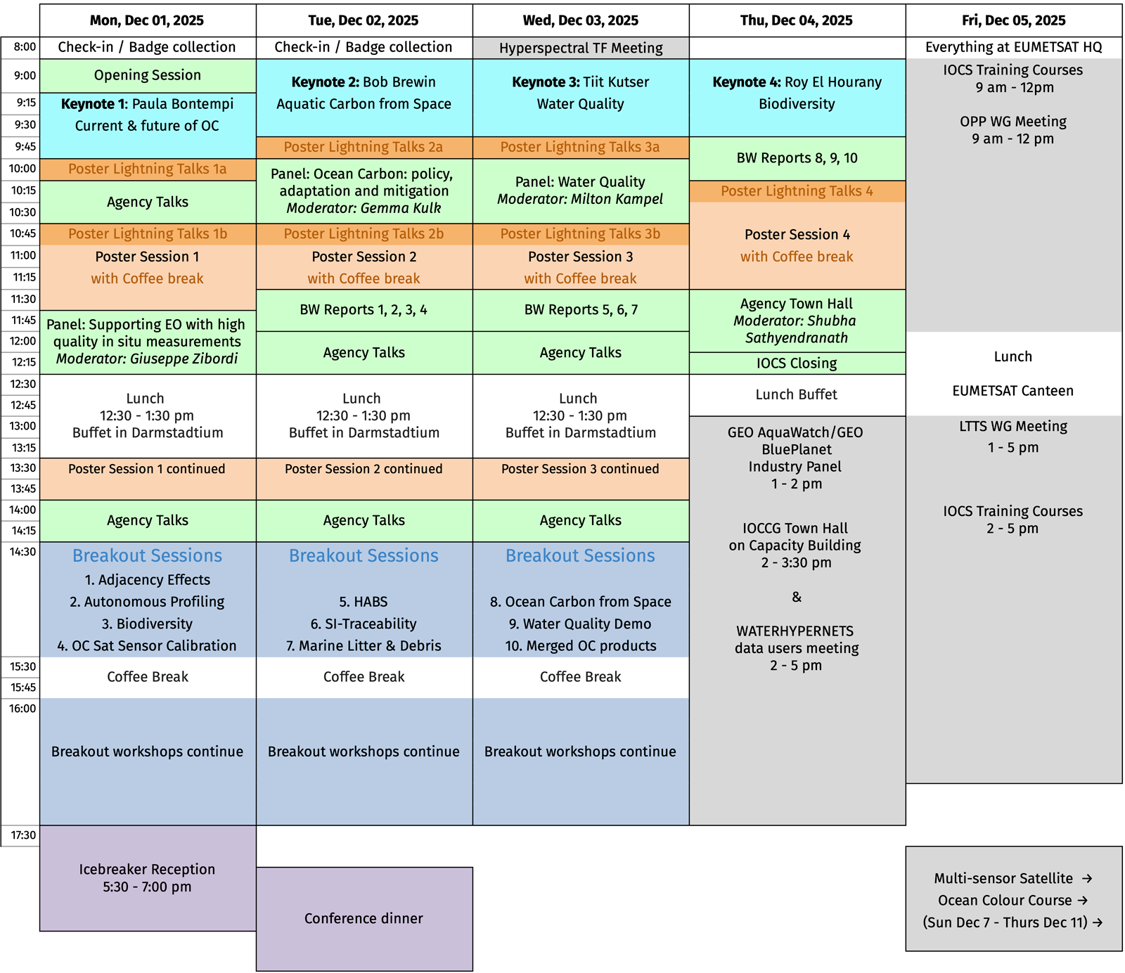 Social events included with meeting registration will be held on Monday and Tuesday evening. IOCS training sessions will run between 9 am and 5 pm on Friday, 5 December 2025 at EUMETSAT Headquarters.